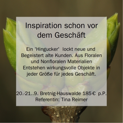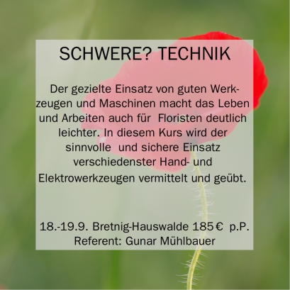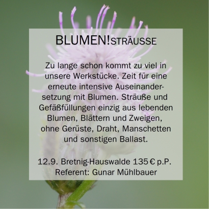 Seit Frühjahr 2017 biete ich gemeinsam mit einem Kollegen verschiedene Kurse rund um Floristik und Dekoration an. Über mein Kontaktformular können Sie die Kurse buchen.